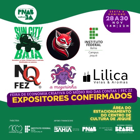 A primeira Feira de Economia Criativa do Médio Rio das Contas (FEC 22), que acontecerá no período de 28 a 30 de novembro, a partir das 14h, na área do estacionamento do centro de cultura de Jequié,criada pelo produtor e gestor cultural Alysson Andrade. O acesso livre e interpretação em libras, vem atraindo empreendedores (as) criativos (as) de todas as vertentes, como a tecnologia, engenharia mecânica, moda e outras.